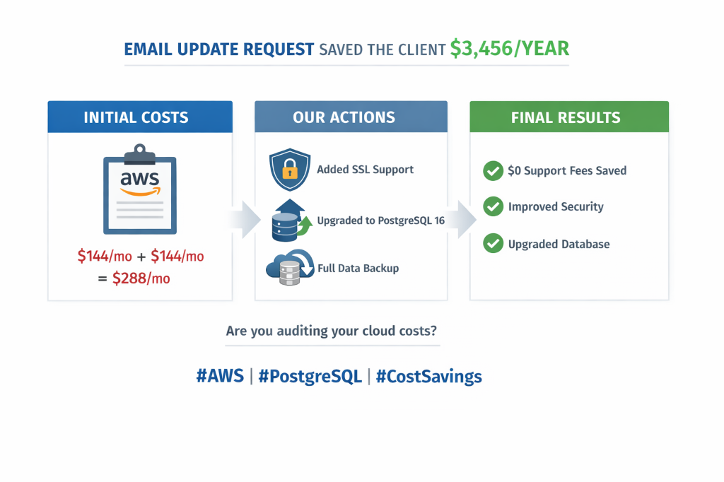 I discovered two PostgreSQL instances incurring "Extended Support" fees totaling $288/month ($3,456/year). The systems were running on PostgreSQL 13.20, which had reached its end of standard support on AWS, triggering a convenience tax for legacy maintenance.